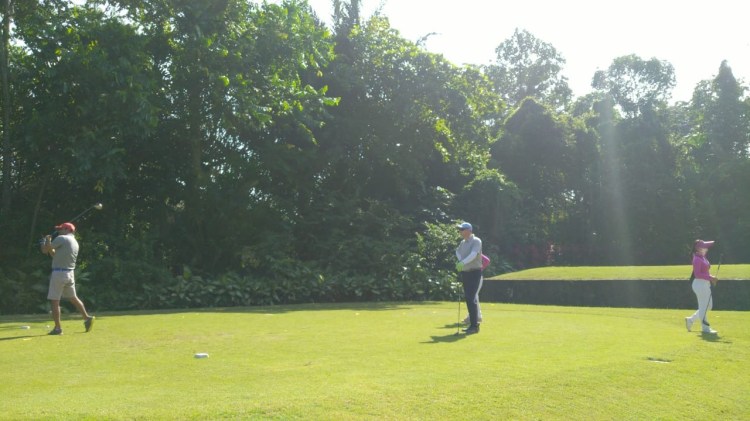 Starting on Hole#16, the New Course’s iconic Par 5, the flight of: Christophe Beau, Imran and TPS and hosted by JAWS Admin Simon Reynolds. Christophe got off to a flyer hitting a towering 5 wood down the right side of the fairways and ending in the first cut. On a busy day at JGCC we were keen to set off from the busy clubhouse area and into the jungle to tackle the Thomson, Wolveridge and Perret championship layout.
