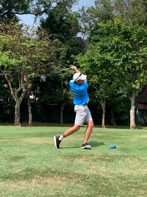 A solid drive followed by a long iron left him a few meters short of the green in two, followed by a chip and a putt for birdie. With some work on bunker play and putting, Aidan is well on his way to a single handicap.