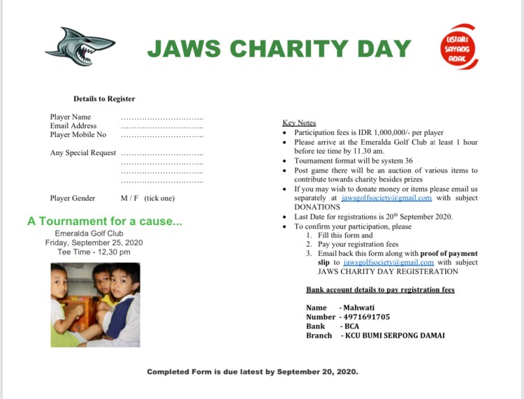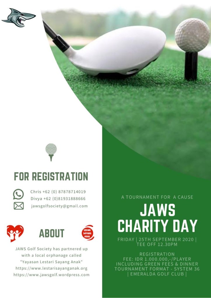 We are having our first JAWS Charity Day Golf Tournament on the 25th of September at the Emeralda GC. We are working with an orphanage called Yayasan Lestari Sayang Anak which takes care of abandoned children and provides them a loving home , education and care.
