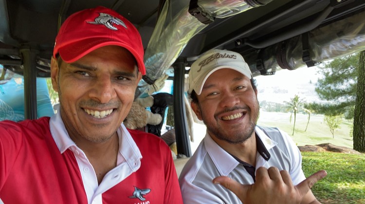 Fernando was there to keep score and a report on the battle. The first hole was typical of the match: Willi fade in hazard on 10, Yudhi booms a drive 200+m in the middle. Willi pulls his third left 100m from green, Yudhi has 30m from the middle.