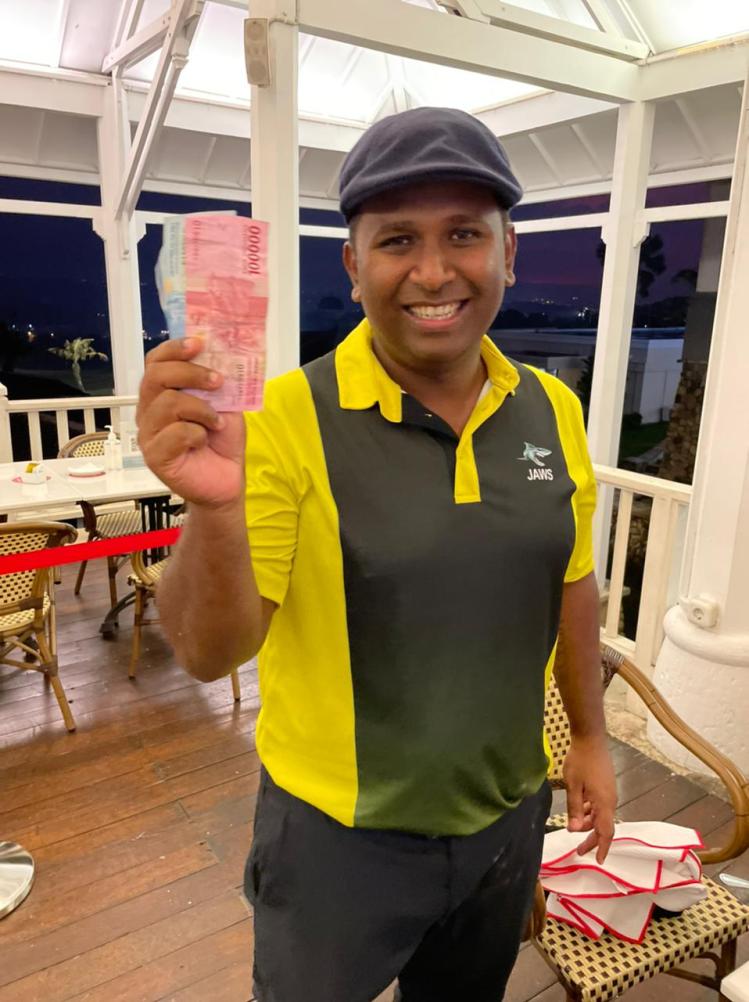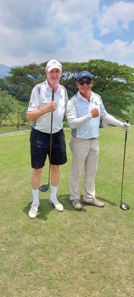 Willi hits 3m from hole and sinks it for 5. Yudhi fluffs a couple and 3 puts for 7 for net 6. Willi wins the hole and the rest is history at 7/6 for Willi. Yudhi learned a lot from the putting and chipping master so not a total loss.
