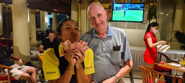 The 4 ball of Diana, Fernando, James LJE & Willi G. teed of at hole 10. Diana and Fernando played their MP game and you could see from the very beginning that Diana was all about Business to get the Job done. Diana started with two solid bogeys with strokes in hand to go an easy 2 up on Fernando. With a HC 24 she was playing close to bogey Golf and scored 47 on the frond 9 to give her a +4 lead in the MP. She continued her steady around bogey Golf the second 9 to finish with 46 and a total of 69 net, winning her MP 5&4.