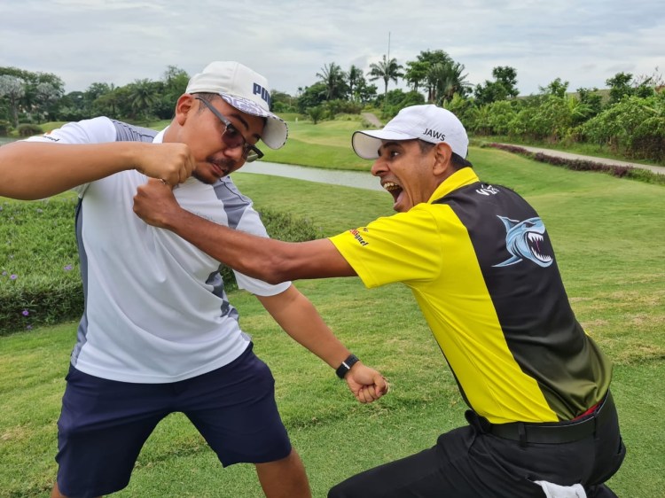 The final flight off Hole#1 witnessed ‘The Clash of the Titans’ or ‘The Clash of the Sharks’. After a slight delay at the start, Divya played really well with 3 pars in a row whilst Firman was struggling to get his game together. By the 9th hole Divya was 2 up and looking unbeatable with a Gross 39 including 7 pars. But there were signs that Firman was getting his act together shooting just one over for the last 3 holes. The game turned around on the back nine with Firman winning the next 3 holes including birdie on hole 11. Hole 15 turned out to be a crucial hole with both players getting bogey but Firman had a stroke advantage. Firman then made an amazing shot from a bunker on hole 16 to make a par and win the match. Credit to both payers for an outstanding match and a pity that one person had to lose today. Meanwhile Mr Agus, after some help, managed to play his best 9 holes with JAWS improving 10 strokes on the back 9 including 2 pars and 2 bogies and if he can continue this in the next game, he will be fighting for the prizes. Too many triples today for Chris who is struggling with his driver and needs to get his confidence back soon. A trip to the driving range is what the doctor has prescribed for him. But today was about a great matchplay and a fantastic battle between two good players.