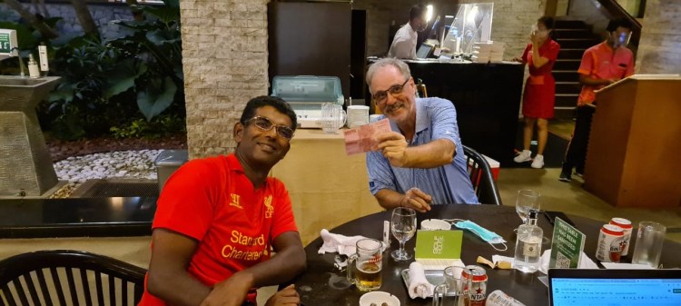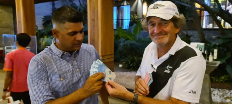 First of tee box 1 was the trio of Jim K, Terence and Fernando. It all looked easy on the first hole with a couple of pars and a double but it went downhill from there. Jim found out what a waste bunker was and proceeded to hit 13 bunkers overall over 18 holes. The (deleted) man can drive long but every stray drive hit a bunker. Bad news at Damai Indah. 102 was the damage. Terence played well on the front 9 missing all the bunkers for a great 45. He lost his precision on the back 9 and hit 7 bunkers. This led to a 51 and 96 total. Fernando was mesmerised by the multiple 200m 2nd shots but he recovered through good chipping and putting on the treacherous greens. 2 OBs hurt hard and he ended up with a 46-44/90. Definitely a course that improves your game if you can master it !