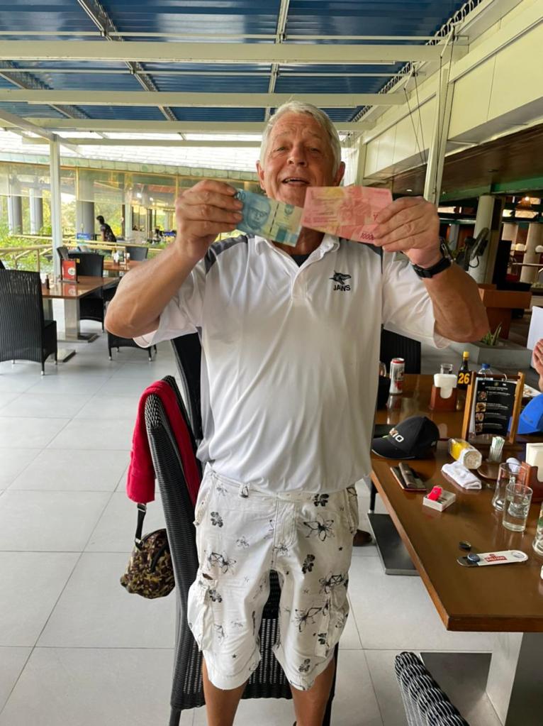 Hari Taufik played his usual game of fabulous straight drives. Unfortunately, his second shots often went in the wrong direction and that cost him. On his first putt of the day he over ran the hole by 3 meters due to the fast greens. After that and for the next 17 holes he always was short … except for a 1m birdie put he made on 11. Up and down game for a 92, net 81.