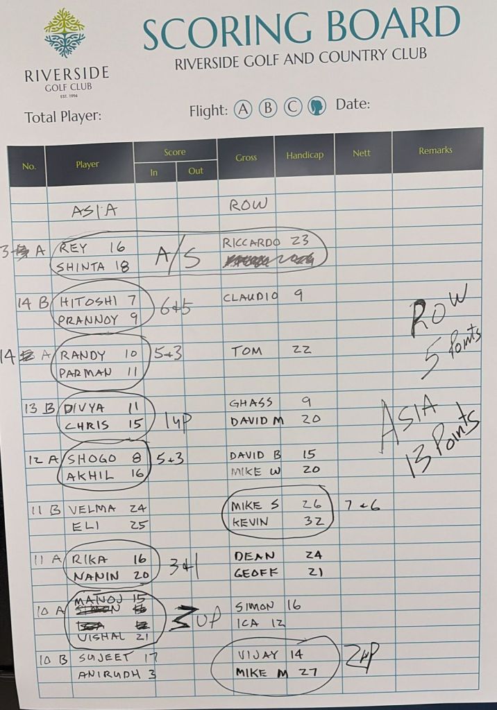 Round 4 is set to be a CRACKER and is scheduled for 7 th November 2025 at Riverside GC and will be *SINGLES F0RMAT*– What that means is 20 players each side playing for a max of 40 points ( 2 points a game) , that translates to minimum 11 matches out of the 20 need to be won by either ASIA or by ROW to be crowned the 2025 Champion team